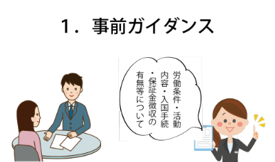 雇用契約締結後、在留資格認定証明書交付申請前又は在留資格変更許可申請前に、労働条件、活動内容、入国手続、保証金徴収の有無等について対面・テレビ電話等で説明します。